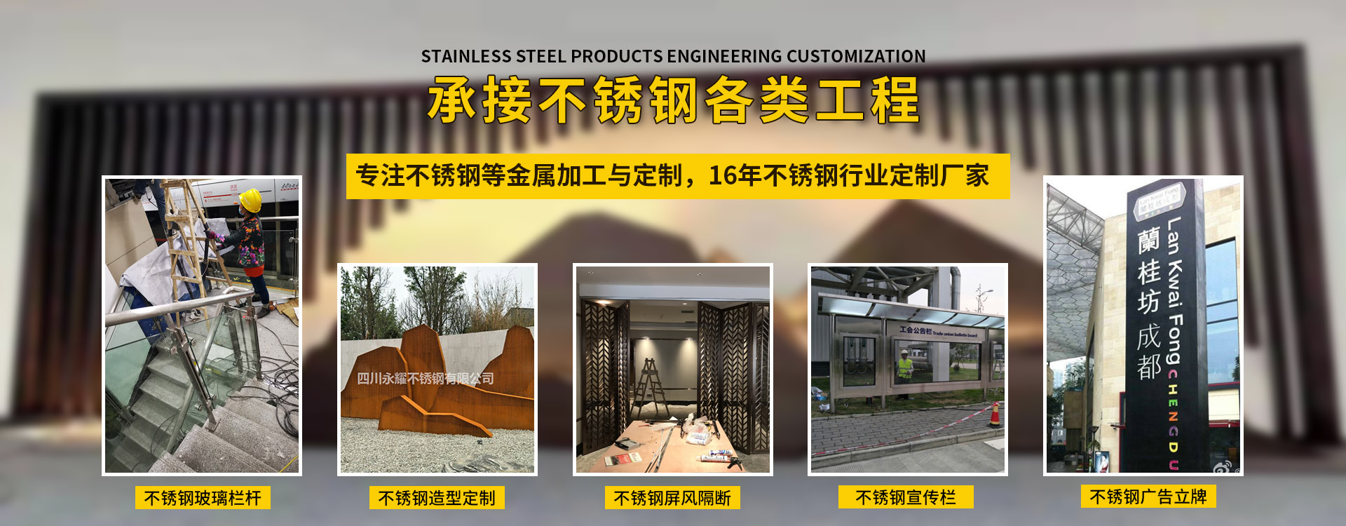 四川永耀不銹鋼有限公司是一家集開發(fā)、設(shè)計、加工、制作、安裝、并承接各種不銹鋼工程為一體的綜合性企業(yè)。多年來一直在專注于不銹鋼等金屬的加工與研發(fā)。在客戶群體中贏得了良好的聲譽,以專業(yè)專注的精神,致辭力于打造良好的產(chǎn)品和企業(yè)形象,對每一產(chǎn)品傾注全力,力爭每個細節(jié)精細,確保產(chǎn)品具有優(yōu)越的性能,優(yōu)美的外觀及優(yōu)良的品質(zhì),使公司產(chǎn)品深受廣大用戶的親睞。 本公司主要業(yè)務(wù): 一、工程類 承攬:酒店、銀行、商鋪、寫字樓、公寓、城鐵、地鐵、公交、機關(guān)、 學(xué)校、廣場藝術(shù)雕塑、自動門、旋轉(zhuǎn)門、廣告欄、公